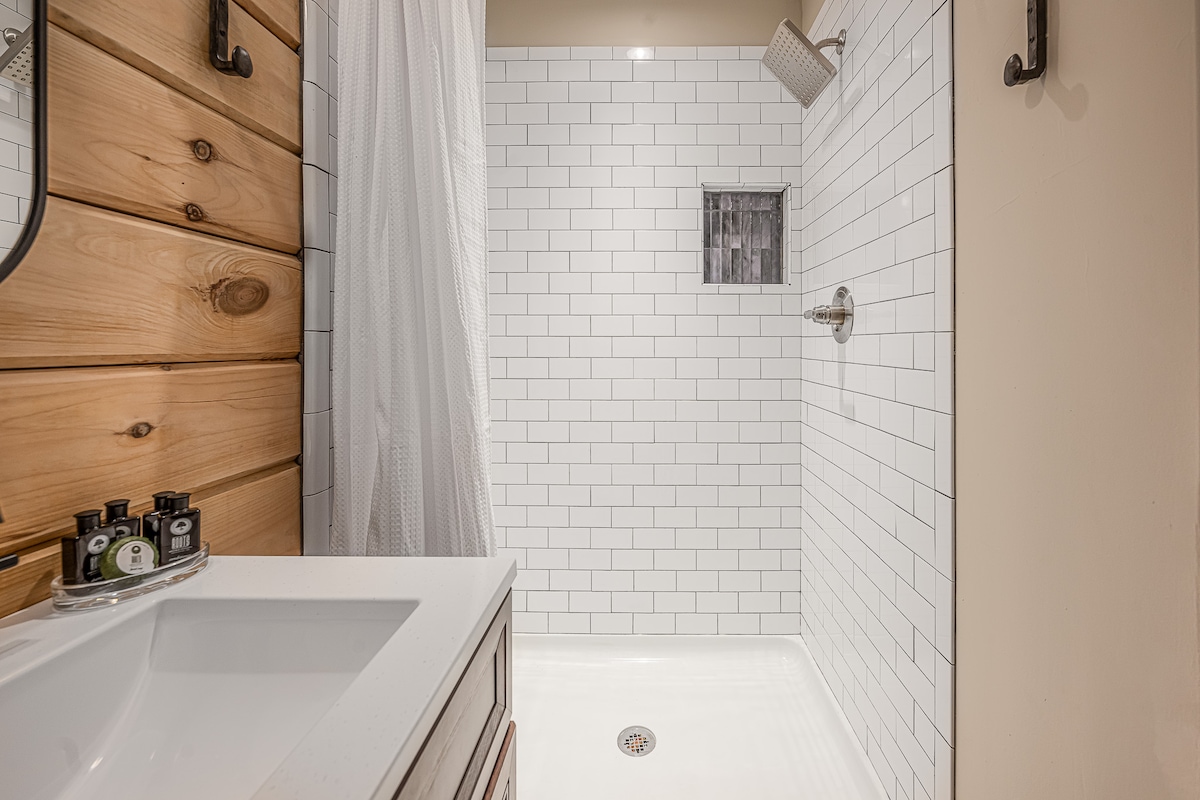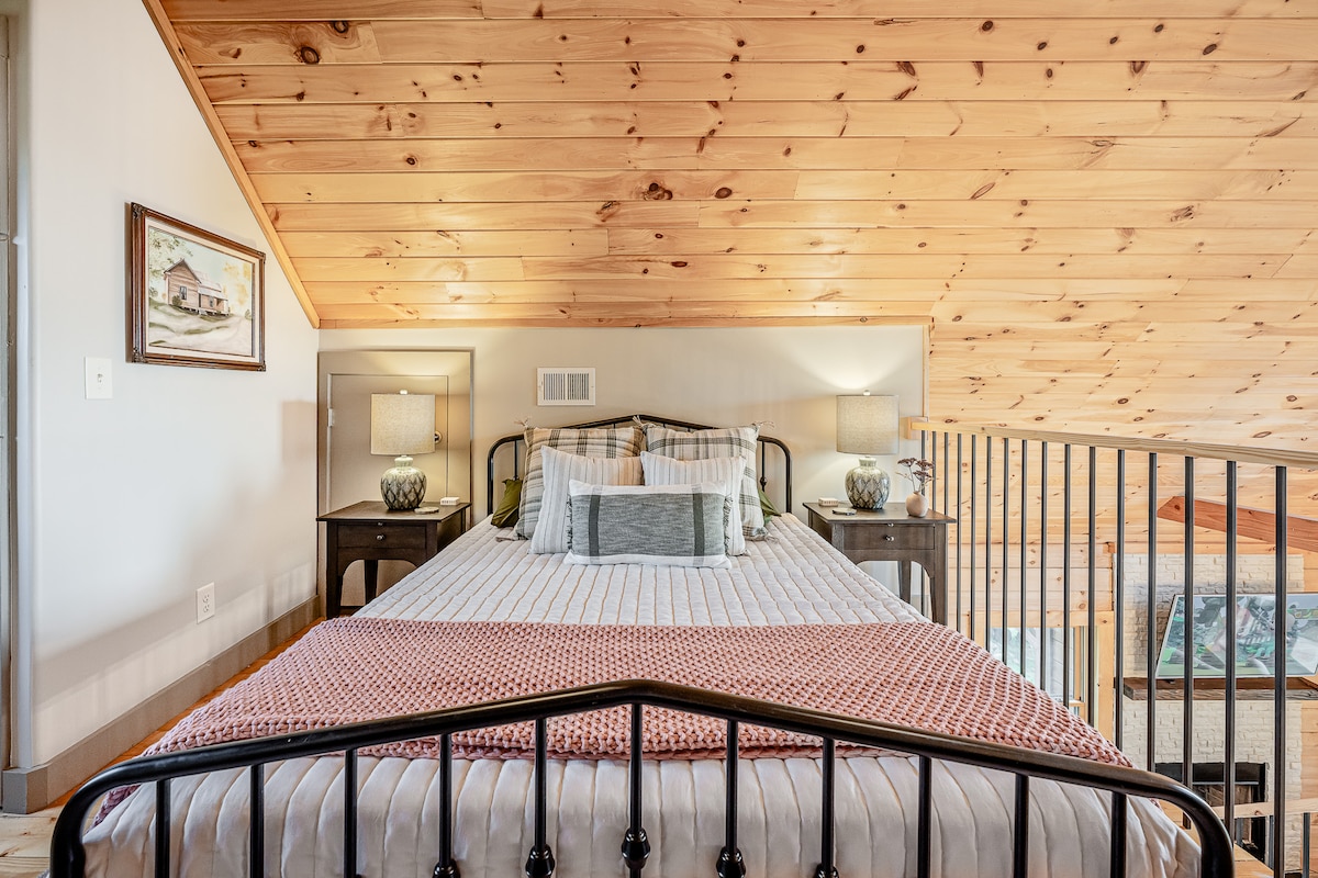 Each bedroom features a queen bed and an en suite bathroom (2 full baths on the lower level, and a half bath in the loft bedroom).