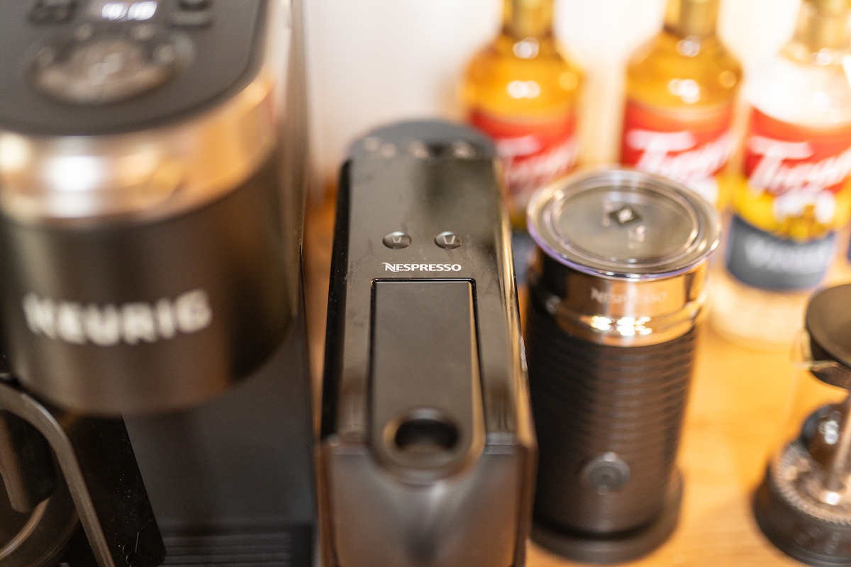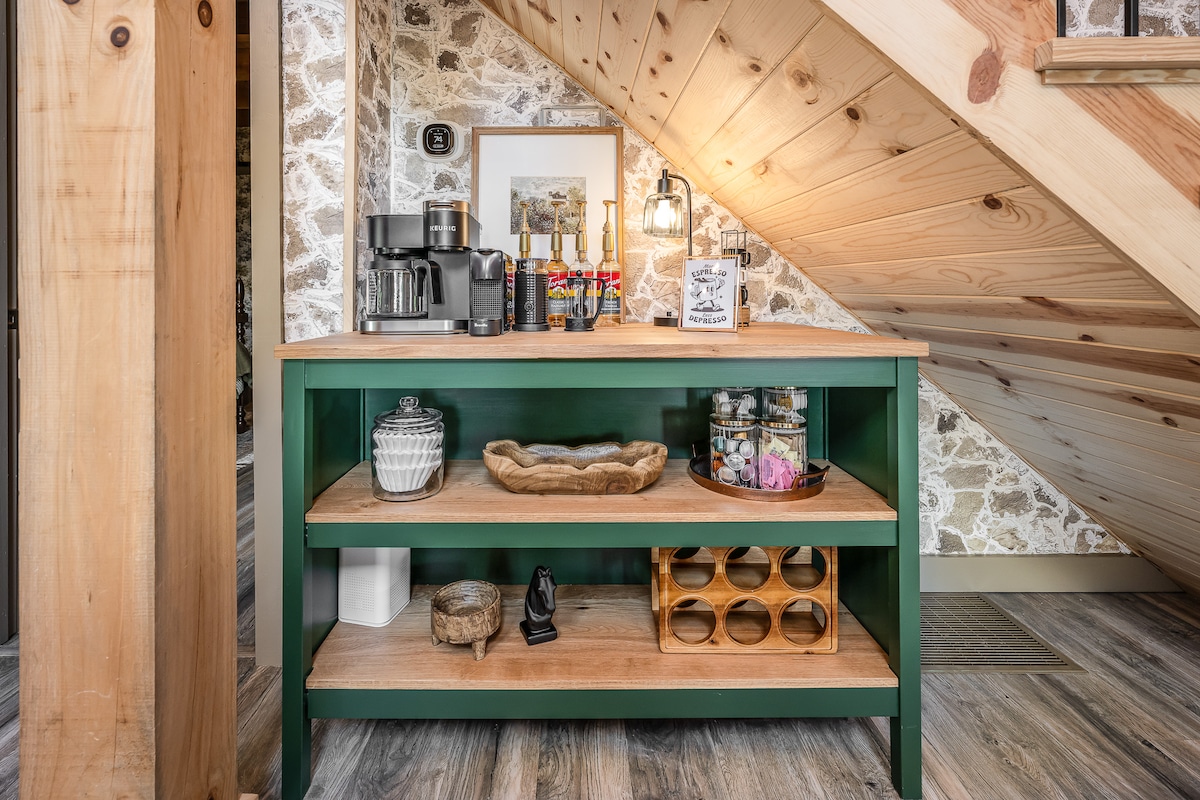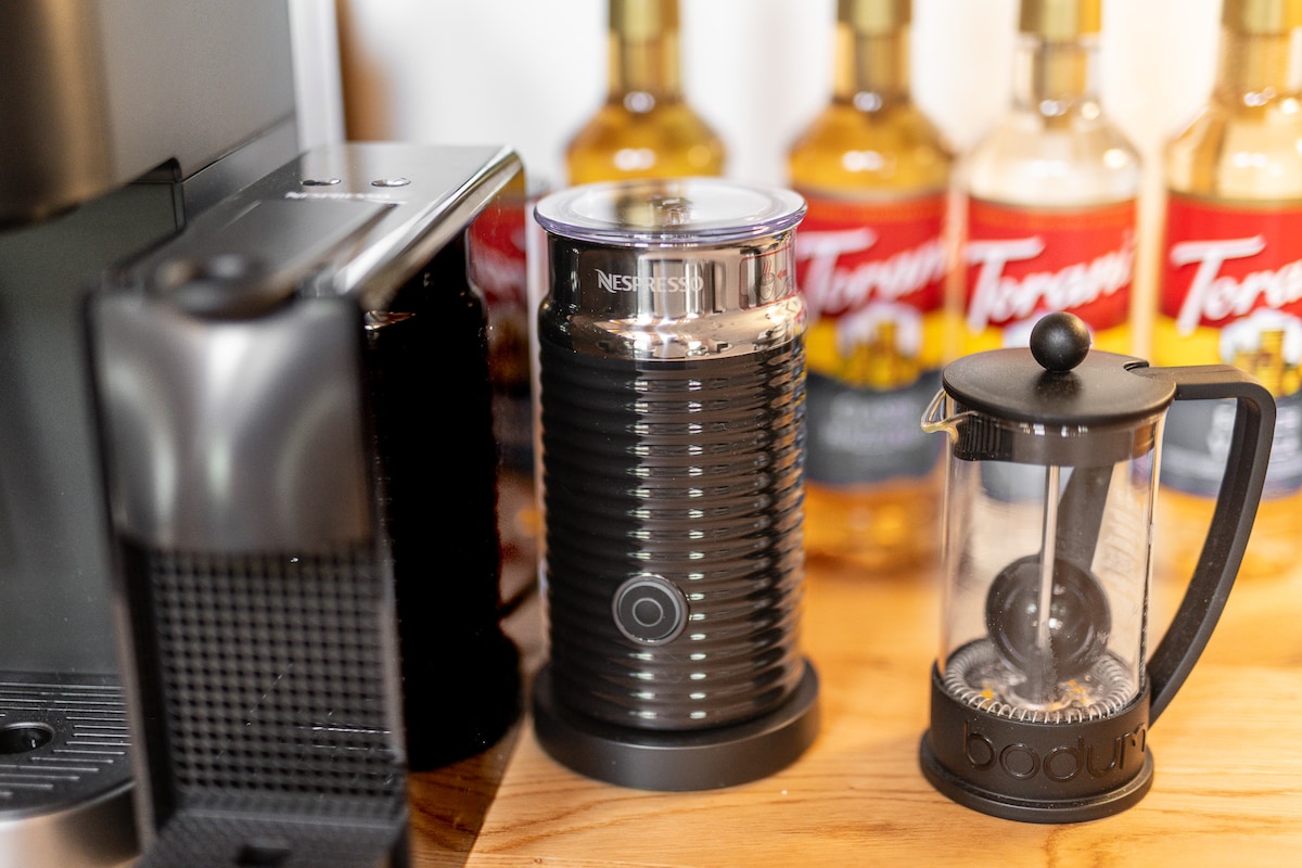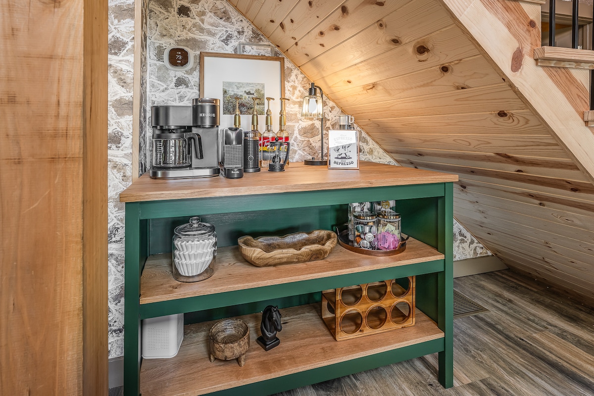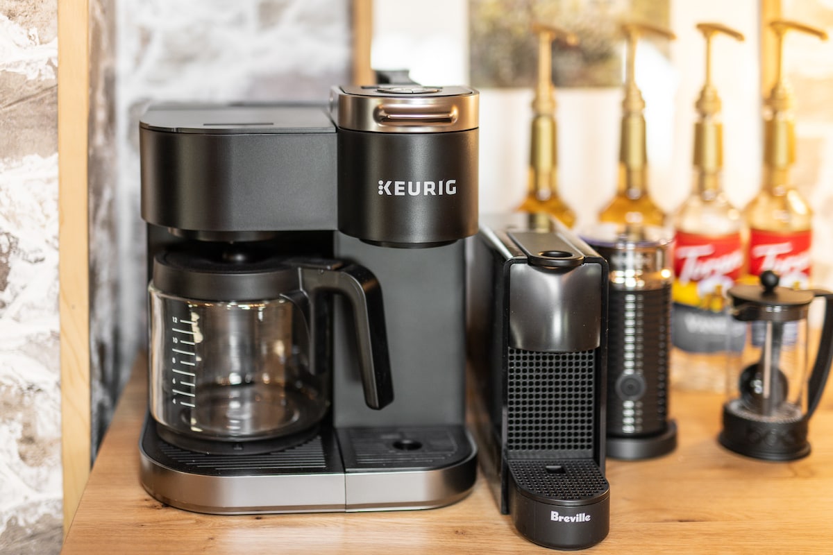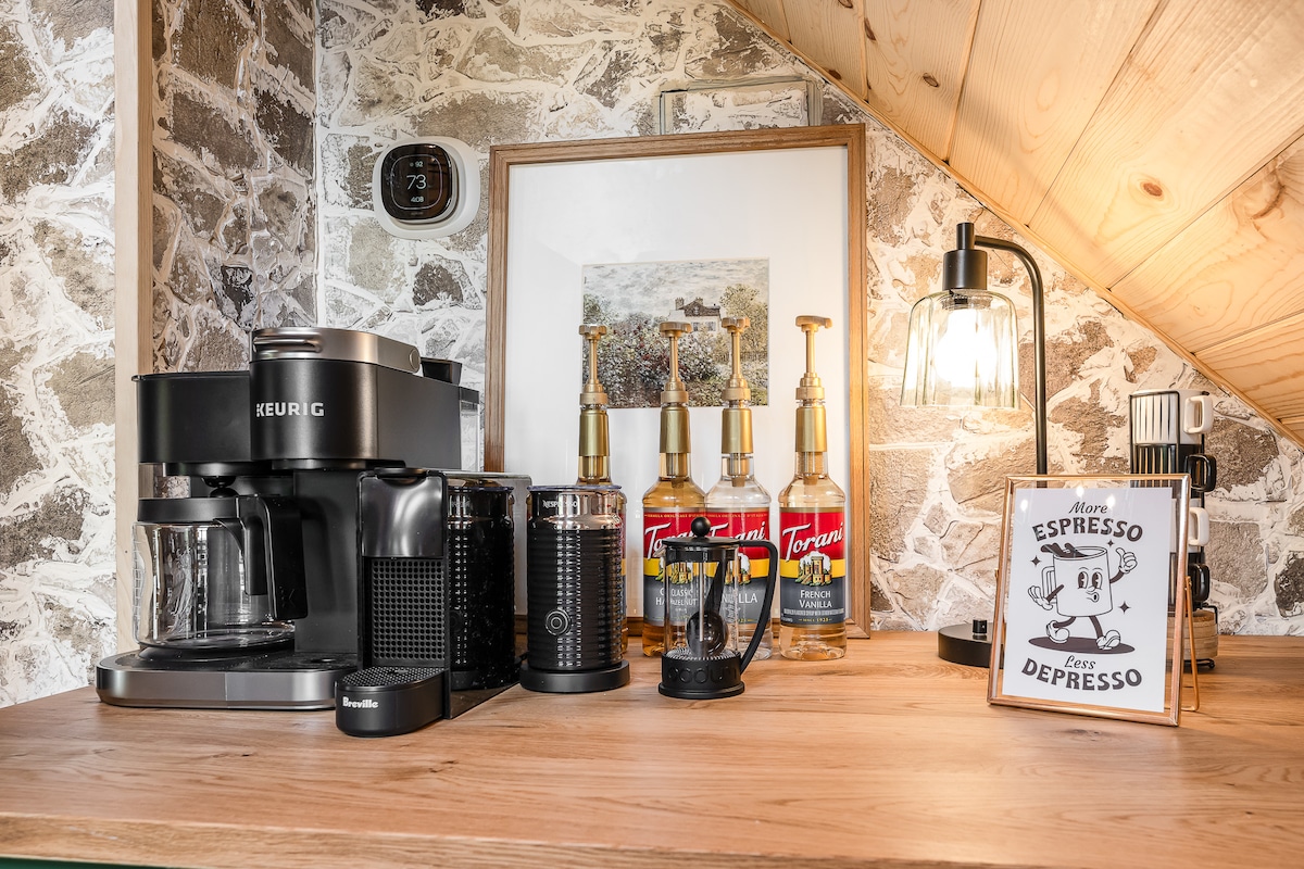 Enjoy the stocked coffee bar with multiple brewing options - K Cup, French Press, Drip and Nespresso. To fully embrace your inner barista, prepare your favorite drink with an assortment of syrups, creamer, sugars and sweeteners. Make cappuccinos, lattes, macchiatos and more. The deck bar is the perfect place to enjoy that morning coffee ;)
